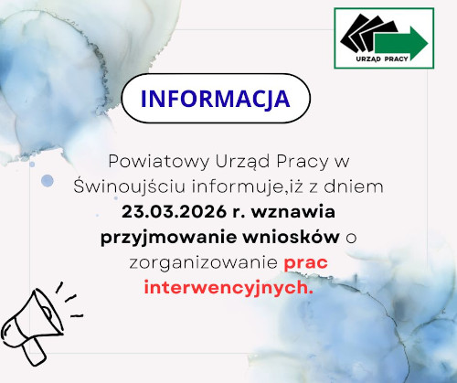 WAŻNA INFORMACJA Powiatowy Urząd Pracy w Świnoujściu informuje, iż z dniem 23.03.2026 r. wznawia przyjmowanie wniosków o zorganizowanie prac interwencyjnych.