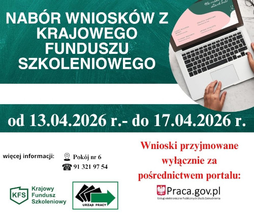 Ruszamy z naborem wniosków z Krajowego Funduszu Szkoleniowego Nabór wniosków o dofinansowanie kształcenia ustawicznego trwa: od 13 kwietnia 2026 r. do 17 kwietnia 2026 r.