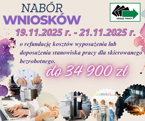 Powiatowy Urząd Pracy w Świnoujściu informuje, że w dniach od 19 listopada do 21 listopada 2025 r. prowadzi nabór wniosków o refundację kosztów wyposażenia lub doposażenia stanowiska pracy dla...