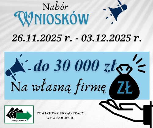 Powiatowy Urząd Pracy w Świnoujściu informuje, że od 4 do 11 grudnia 2025 r. trwa nabór wniosków o dofinansowanie na podjęcie działalności gospodarczej.